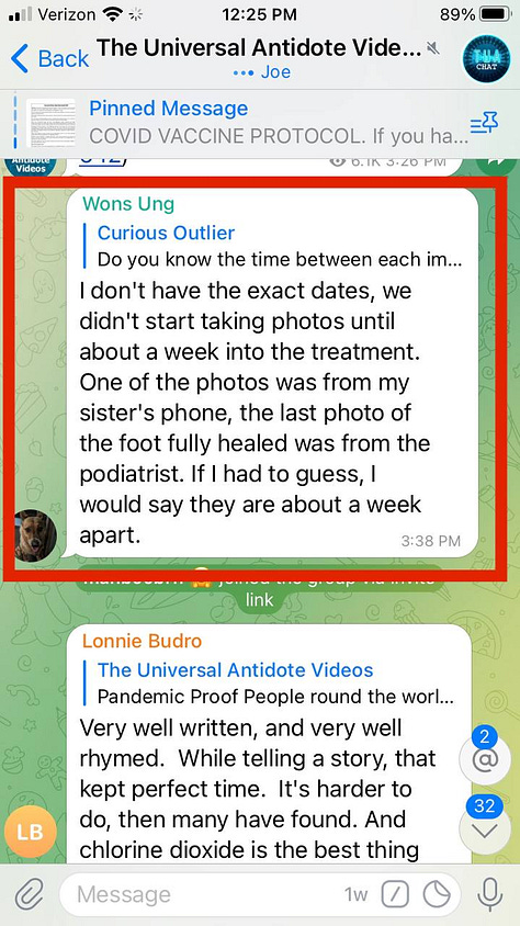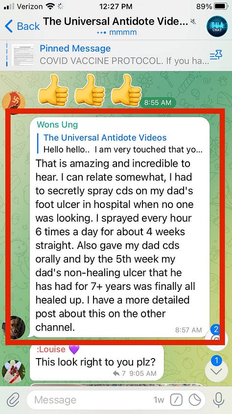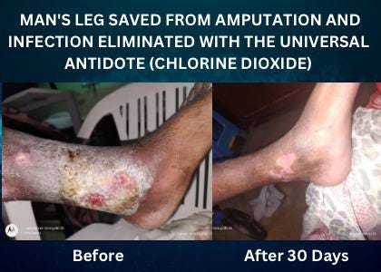 “My next door neighbor was hospitalized because a truck ran into his work house and a wall fell on him. He had a savage wound to his lower leg above the ankle that got infected. Doctors gave up trying to heal it and told him they believe the leg should be amputated below the knee. My son took him a strong batch, 10 drops per ounce, of CDS in a 3 ounce spray bottle from Walgreens and instructed him not to let the doctors know. It healed, the doctors were shocked, and when he showed him what he was using, they didn’t want to know. I have incredible before and after pictures. Does anyone know how I can get these to an admin to maybe post them?”