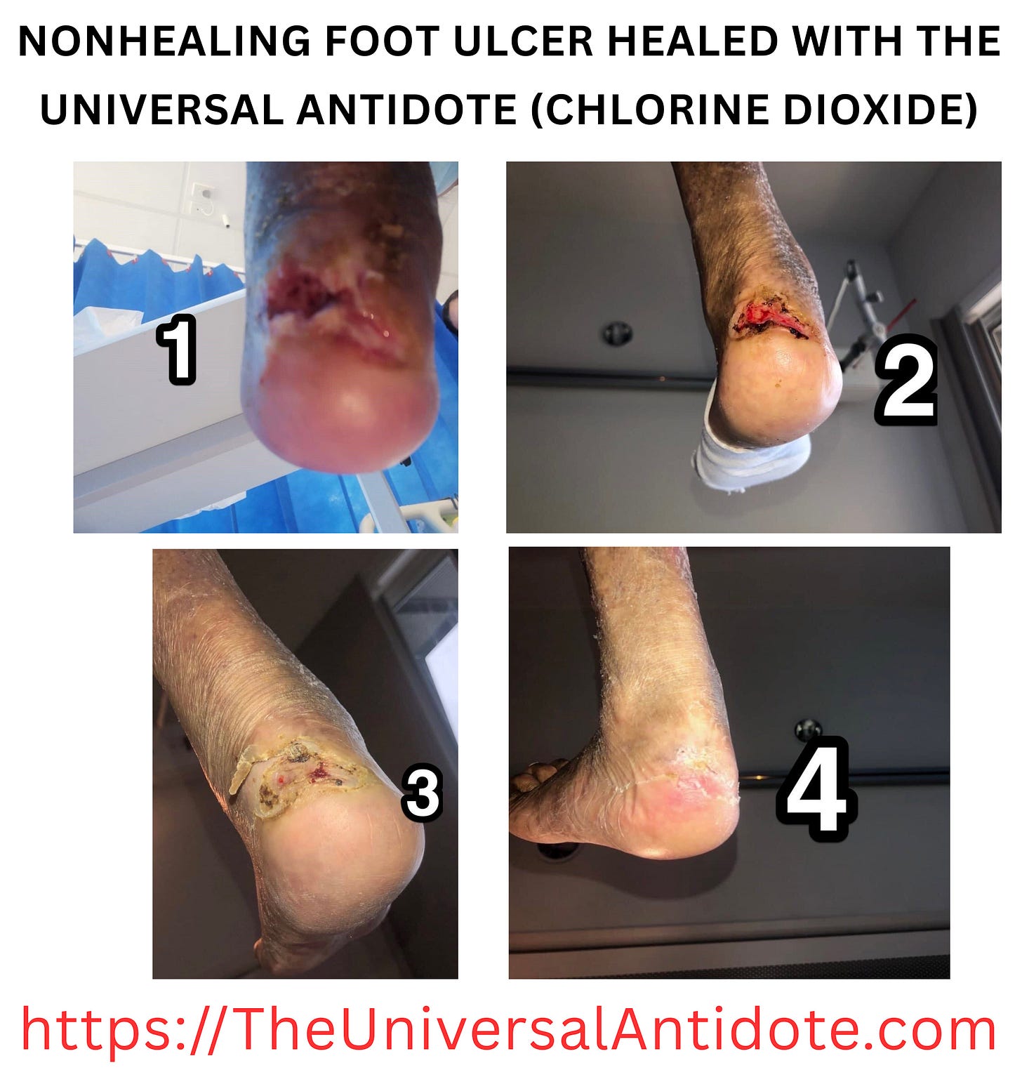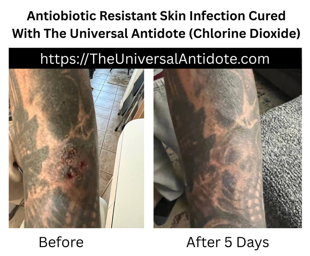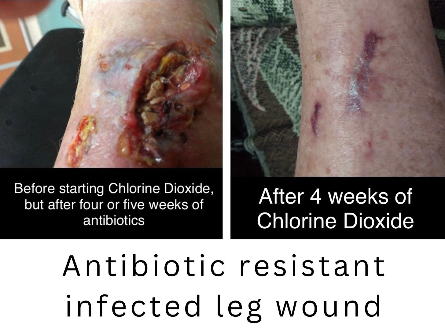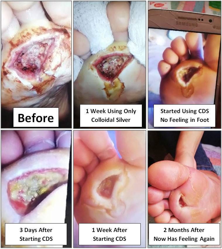 “In the gross picture, he had already been hospitalized 4 or 5 weeks. They gave him tons of intravenous antibiotics but nothing worked. His doctors told him at that point they felt they needed to amputate his leg to prevent a gangrene type infection from developing and spreading... That is the point at which I learned of his injury from my son. We sent him a spray bottle of CDS which his wife snuck into the hospital. It only took about 4 weeks or so from that point for it to heal completely. He told me that within the first 2 days he knew it was healing.”