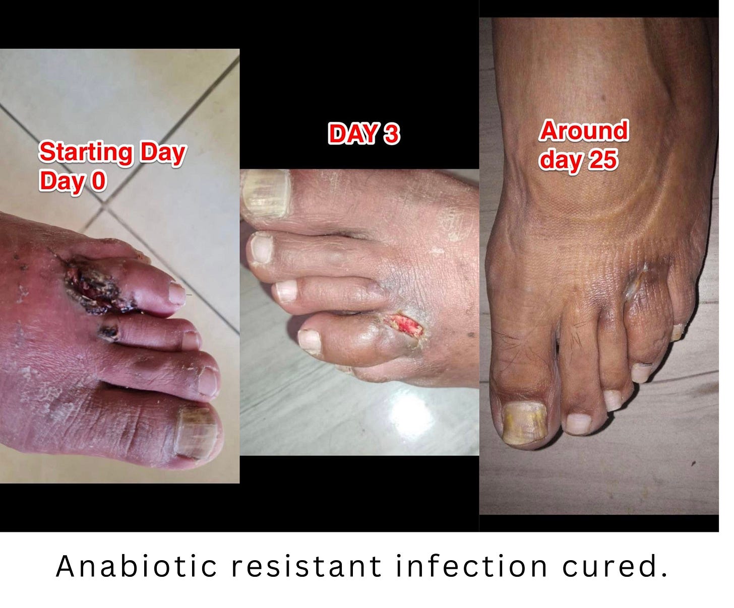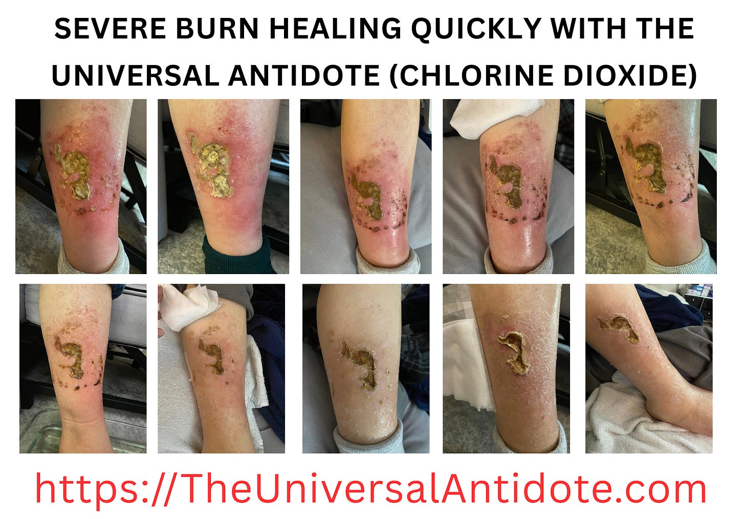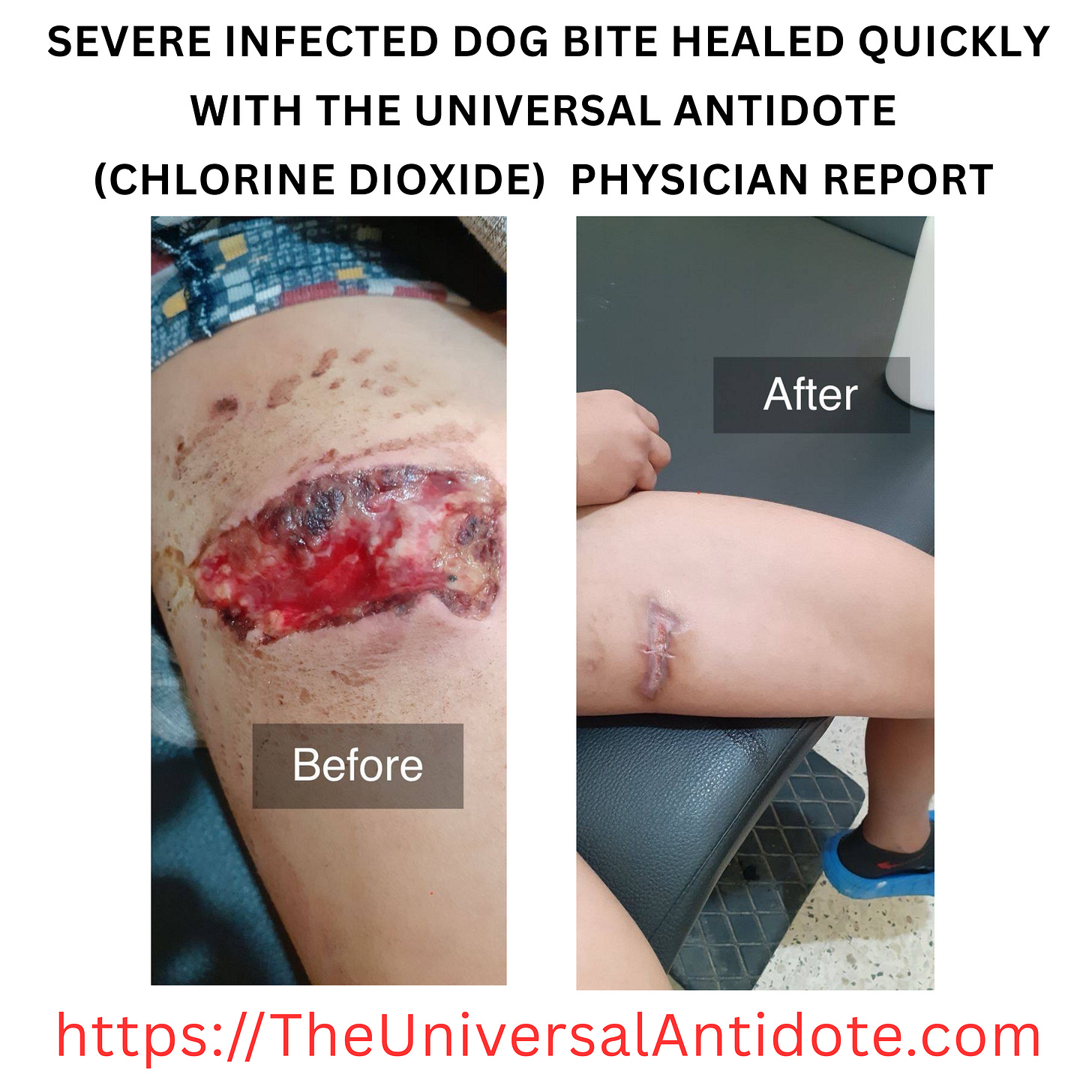 “In the gross picture, he had already been hospitalized 4 or 5 weeks. They gave him tons of intravenous antibiotics but nothing worked. His doctors told him at that point they felt they needed to amputate his leg to prevent a gangrene type infection from developing and spreading... That is the point at which I learned of his injury from my son. We sent him a spray bottle of CDS which his wife snuck into the hospital. It only took about 4 weeks or so from that point for it to heal completely. He told me that within the first 2 days he knew it was healing.”