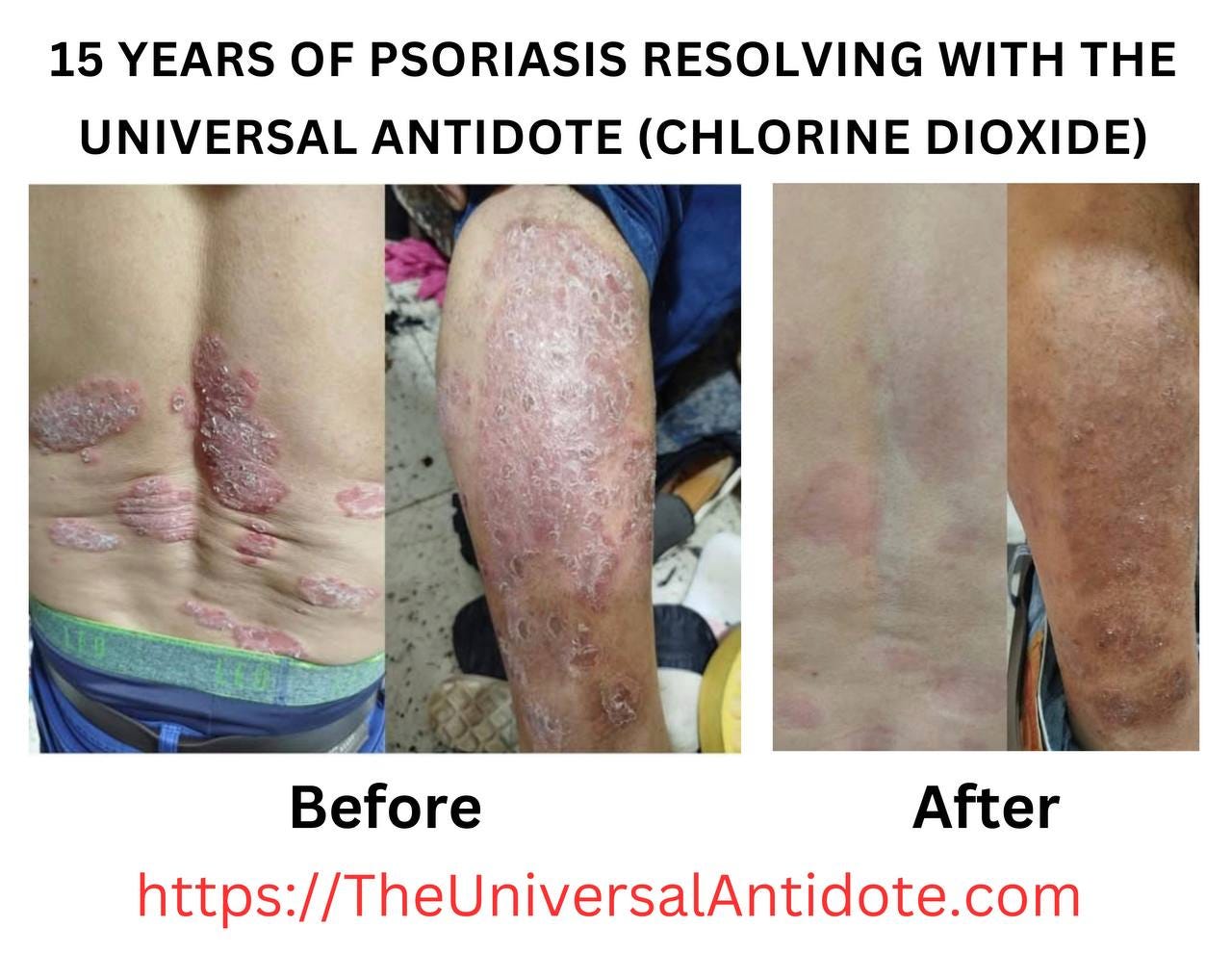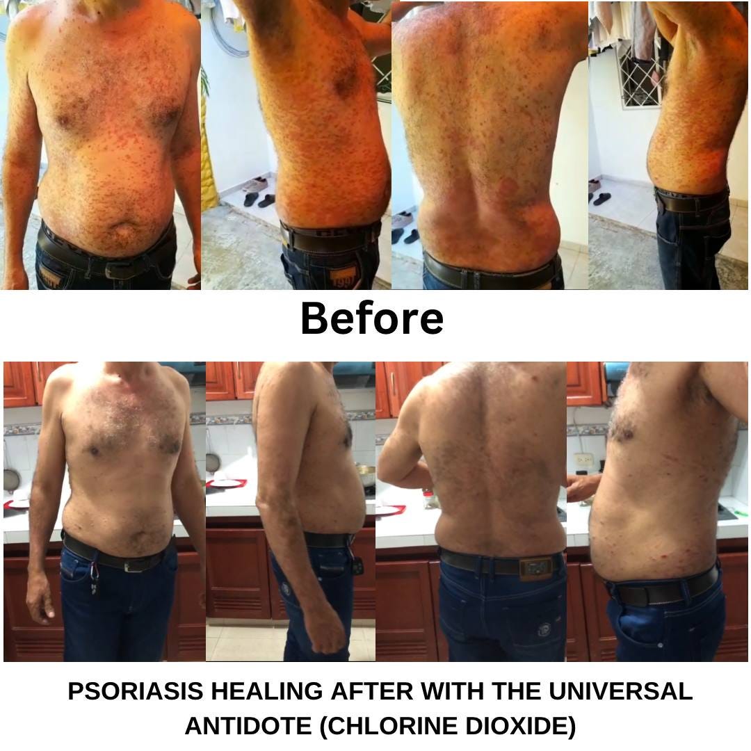 “38-year-old man, with psoriasis since he was 16 years old. Treatment with DMSO in a spray bottle, (because it was in many parts of the body) after CDS 50% and 50% water. Result in less than 30 days, and taking CDS protocol C until now.”