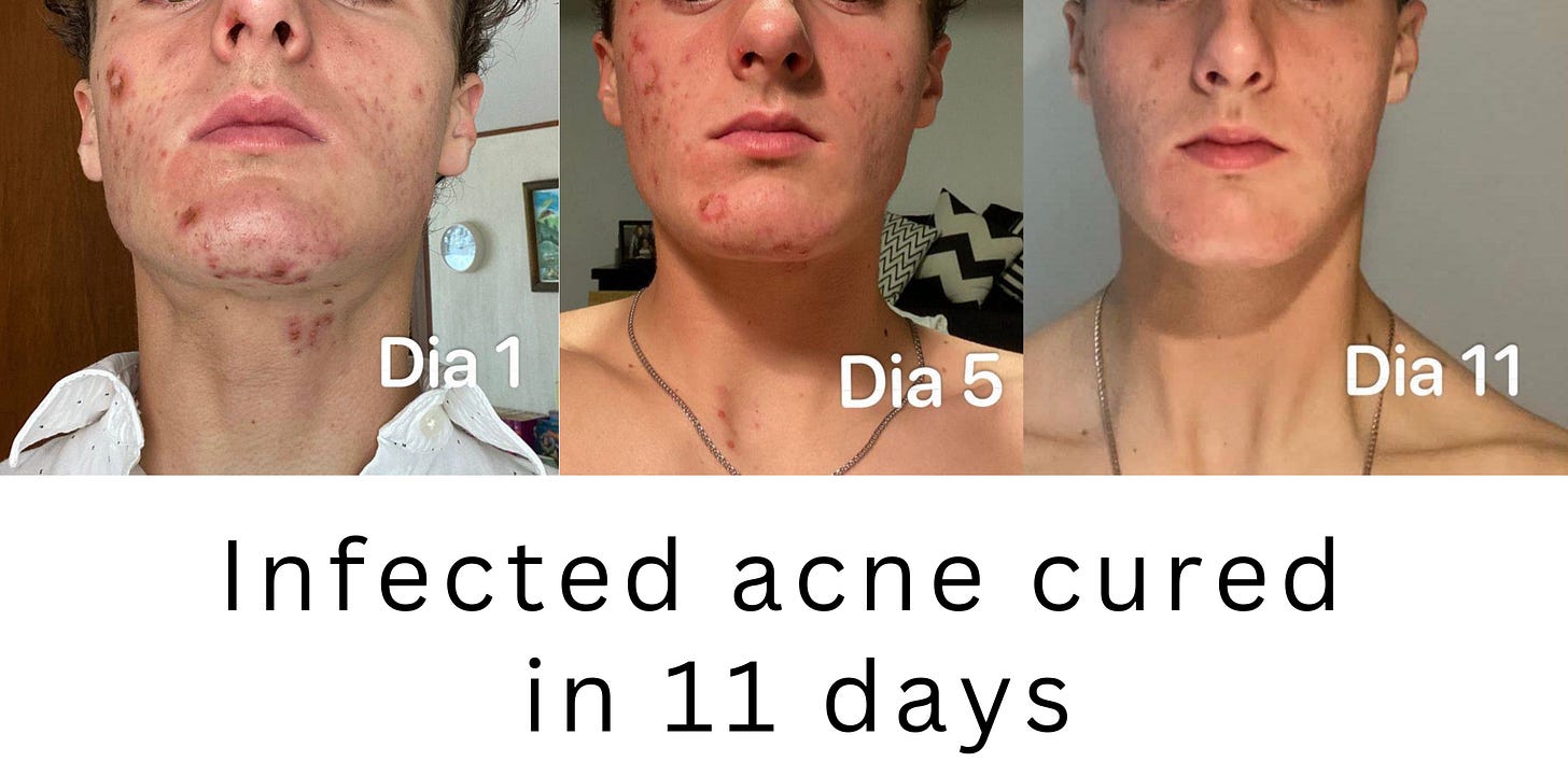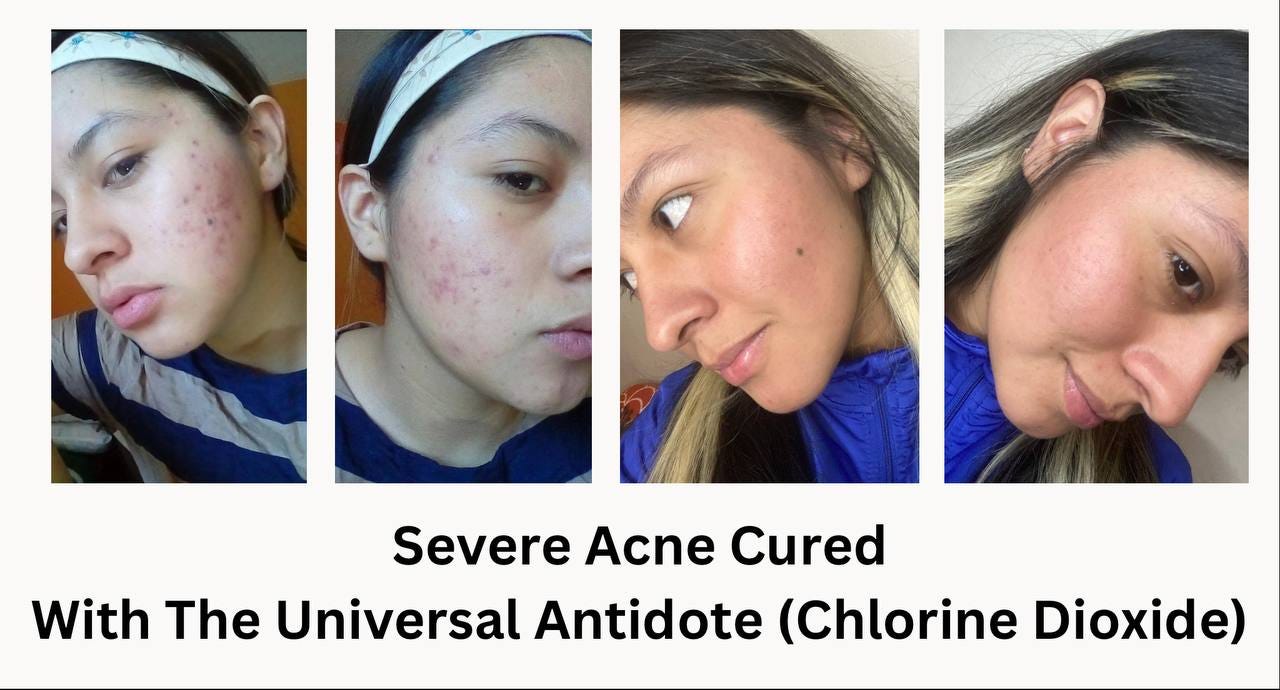 My acne started when I was 12 years old. Since then, it’s been super inflammatory, mostly on my cheeks and around my lips. It was so aggressive that my face looked swollen until I went to a general practitioner, and he prescribed a topical oral treatment. My acne improved, was no longer as inflammatory, and my face no longer looked swollen. But my continuous acne was not completely cured, years went by and I continued to break out. At 17, it became inflammatory again but not as severe, but there were a lot of breakouts on my cheeks, forehead, around my lips and temples. My acne continued for years until 2019 when I learned about CDS and DMSO but I didn’t have faith in it so I only used it twice and it dried out the breakout, but I didn’t continue using it and until 2022 I decided to use the topical protocol well, which is CDS, DMSO and again CDS in sprite everything and it was what made my acne disappear and improve a lot! I’m attaching photos of what my skin looks like today and photos from the past ✨