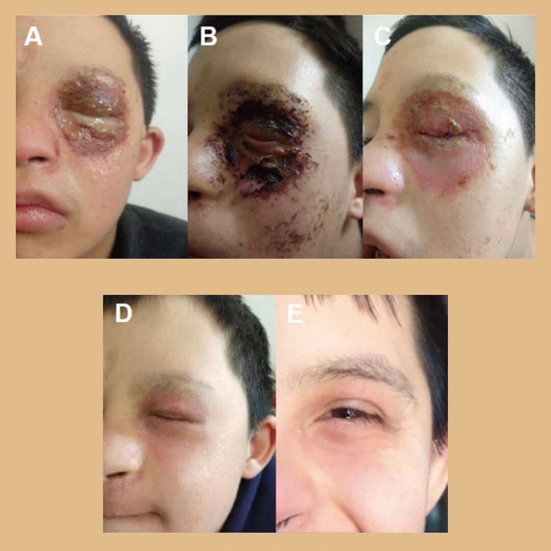“Follow-up of skin regeneration after heat-induced eyelid burn. (A): Lesion on day zero of treatment; (B): Lesion on day 2 of treatment; (C): Lesion on day 4 of treatment; (D): Lesion on day 14 of treatment; (E): Lesion on day 22 of treatment.