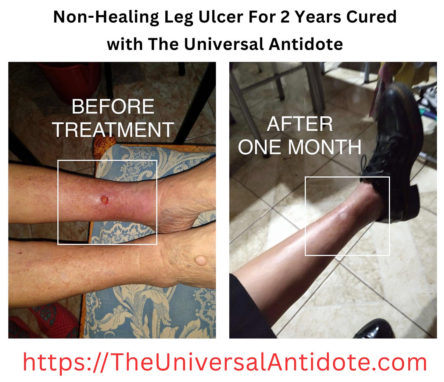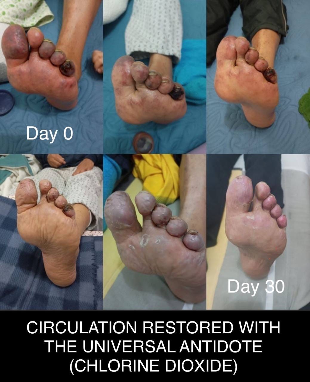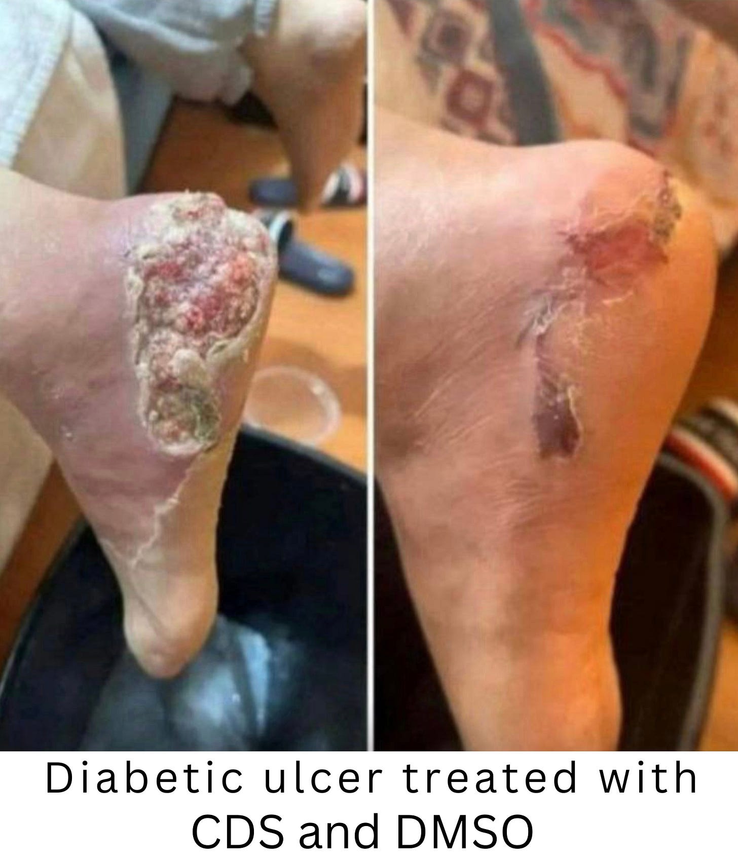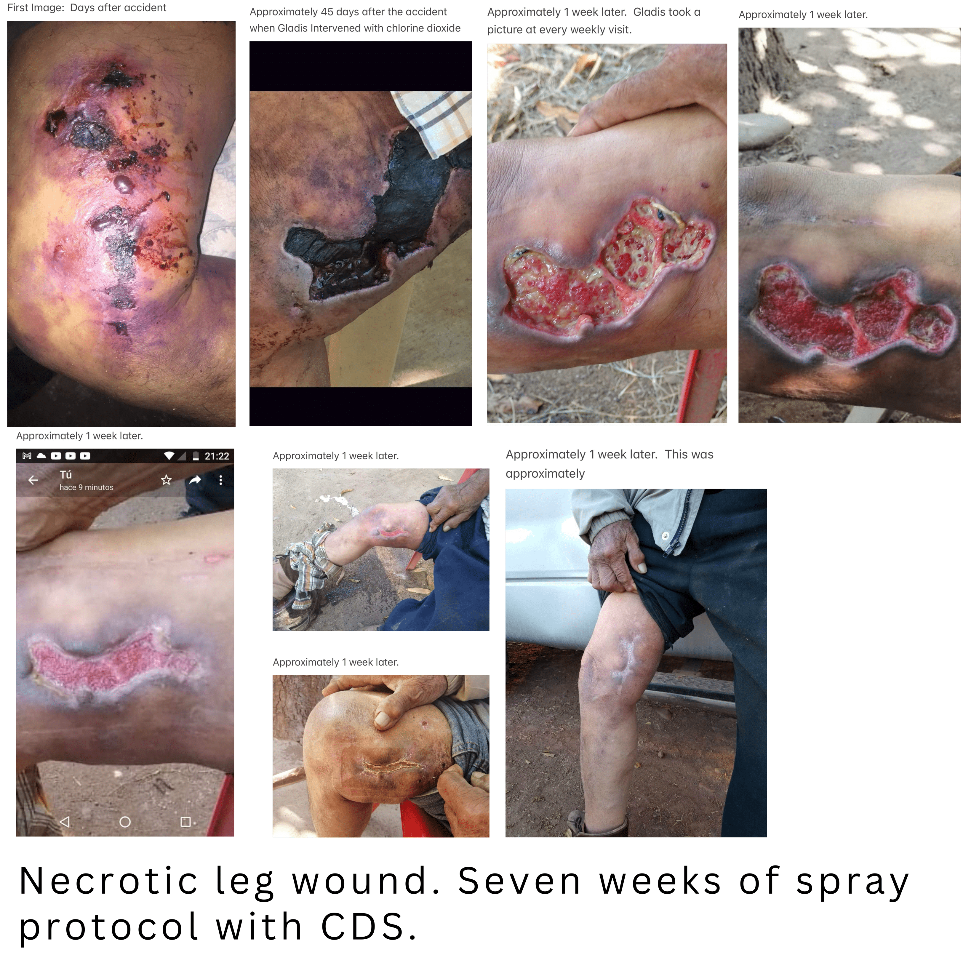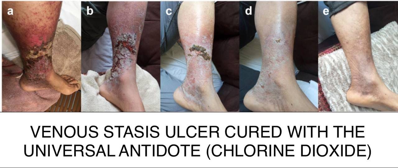 “I’ll tell you a case that luckily I was able to help with CDS and DMSO. I’m attaching photos. They were going to amputate his leg, and I told him first why he doesn’t try CDS and DMSO and then go to the doctor. After a month of using it, he sprayed CDS on the wound and put it where the veins and arteries pass (since they were obstructed) which was the reason for the amputation. CDS + DMSO + CDS. When he went to have it redone, his arteries and veins were clean and his leg was intact. The first photos were when he left the hospital, the last photo is after 30 days of the application.”