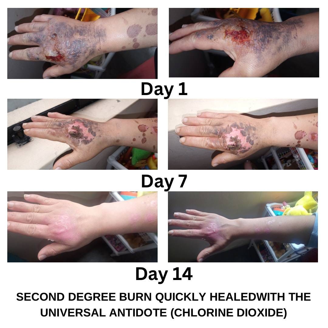 “First day of applying CDS spray and Protocol C, second-degree burn from cooking oil.