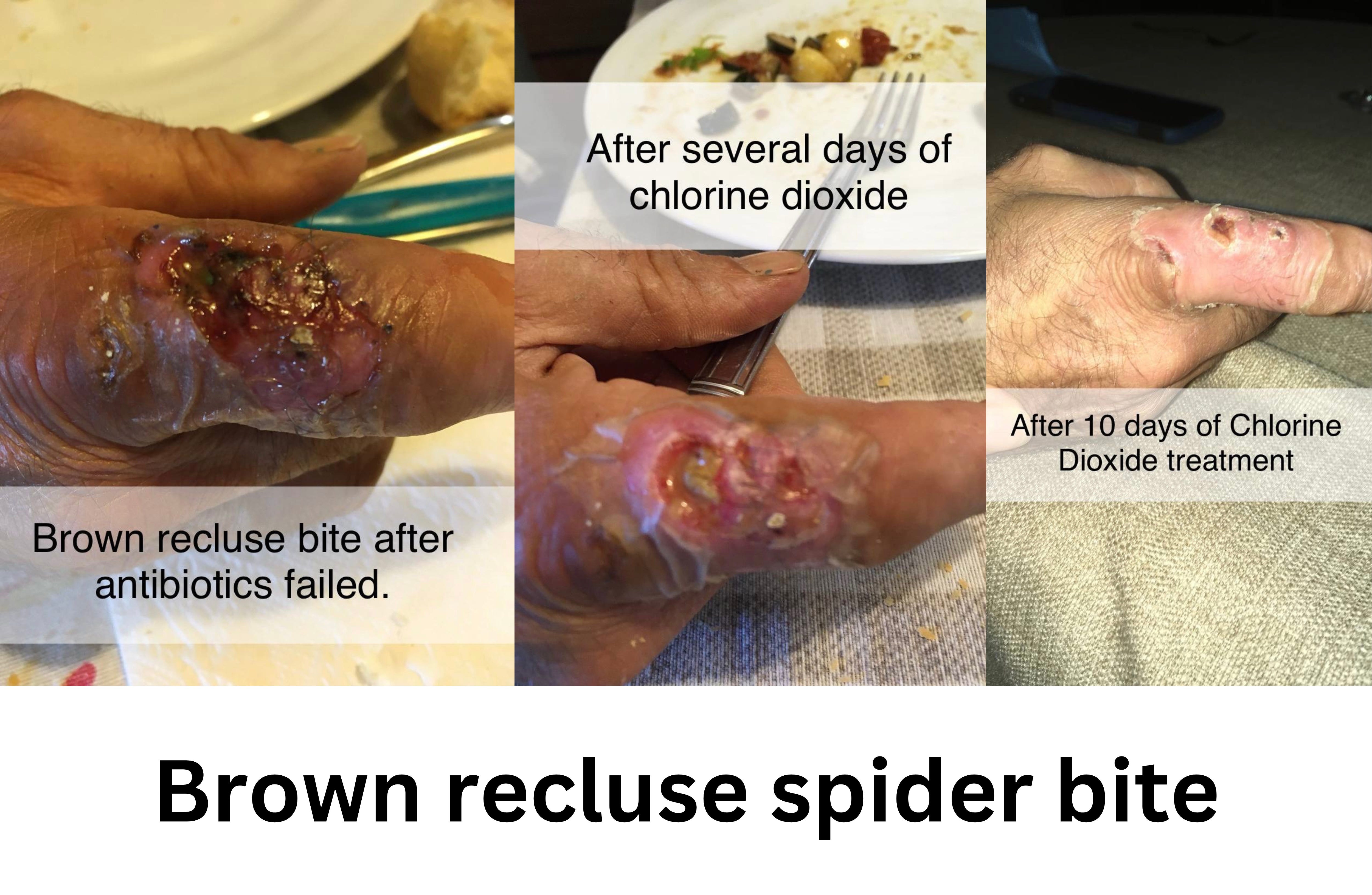 “Brown recuse spider bite, after a few days of antibiotic which was not giving the desired results I decided to apply CDS and Dmso, in a 30 ml dark glass bottle I put 20 drops of Dmso and 25 ml of CDS, sprayed directly on the injured area, the first week once every two hours then 3 times a day, these are the results in 10 days of treatment”