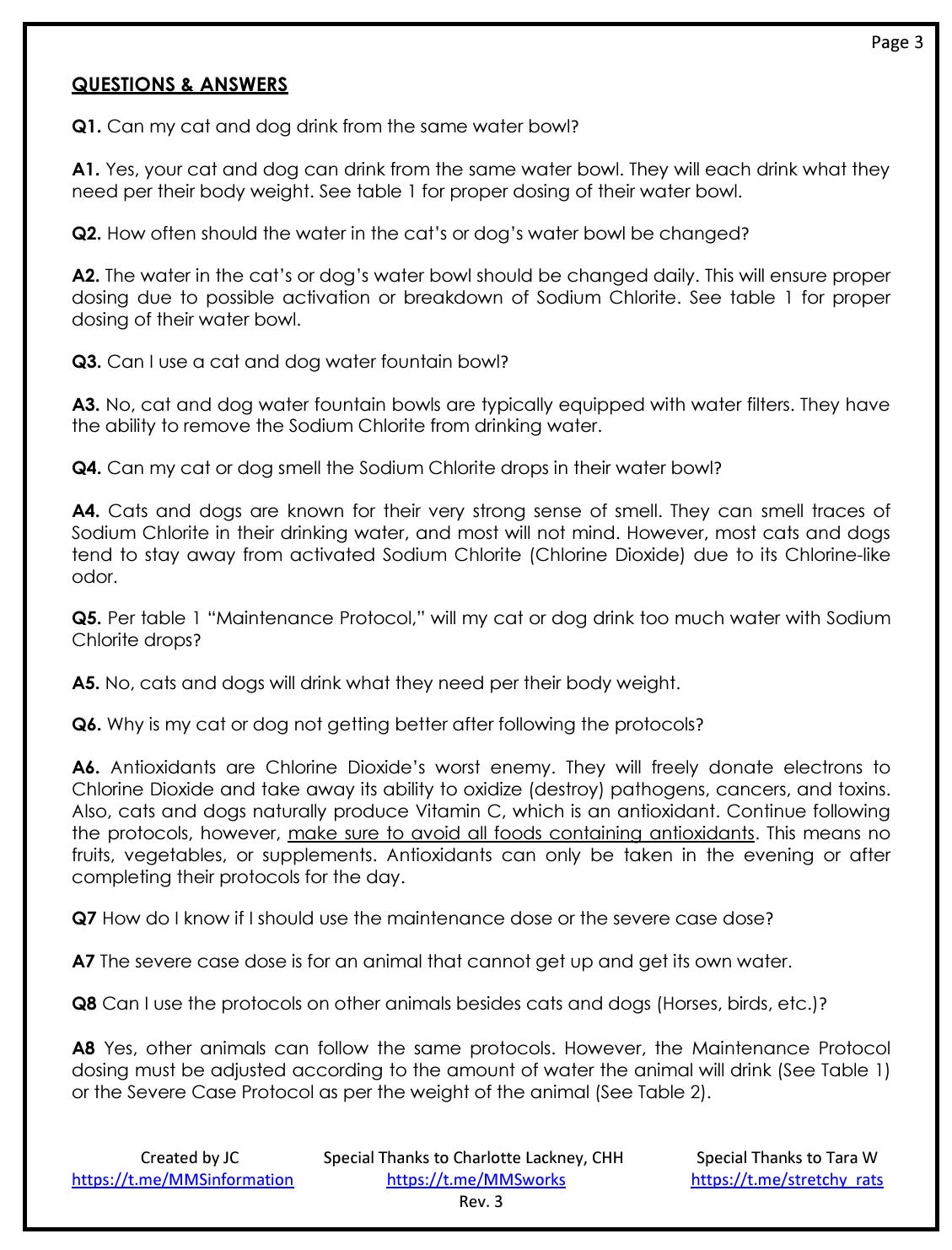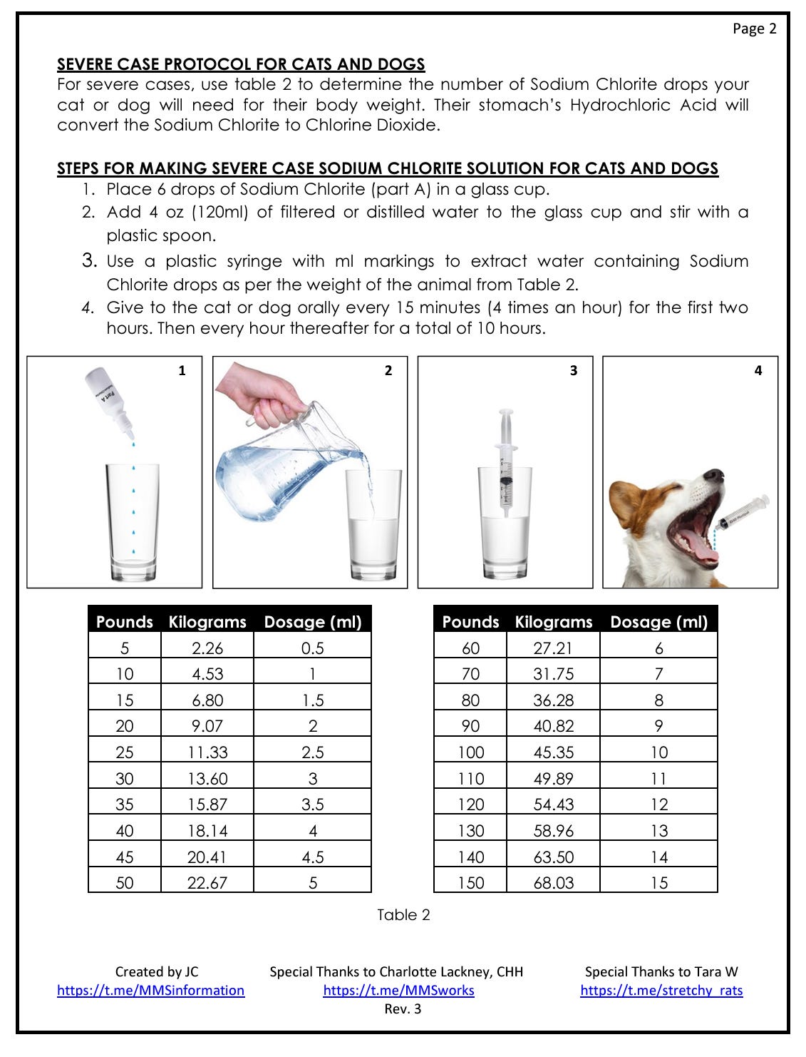 Jim Humble had a detailed pet protocol utilizing MMS1 (activated MMS) in his “MMS Health Recovery Guide Book.” Since the publication of that book, many MMS users have found that their pets often disliked the taste of the MMS1 (activated MMS). Many people found that their pets preferred the unactivated sodium chlorite in water and, when given the free choice between activated and unactivated, they would choose the unactivated sodium chlorite. Also, the instructions for the weight-based use provided in the health recovery guidebook can be confusing, and this simplified method is completely dummy-proof. This protocol utilizes the animal's stomach acid to activate the MMS, generating chlorine dioxide in the stomach. The entire method is described in the PDF download below.